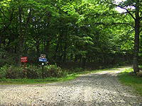 展望台を過ぎ、5分程で目黒地区に入ると国道336号から左折。案内標識(左写真)が小さいので見落としそうになる。 ここから9.2km、最初は舗装道路だが途中からはダートとなり、分かれ道(林道)がいくつかあるのでタヌキ君の案内板を頼りに進むことに。 |