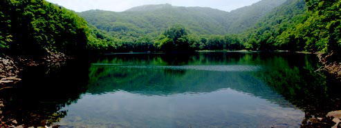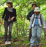 何とも神秘的な湖である。![]() 湖畔を30分くらいで一周できるということを田中さんから聞き、写真正面に見える先端へ左回りで散策することになった。 |