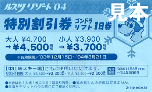 有効期限:ルスツリゾート '04/03/21迄、中山峠スキー場 '04/05/05迄となっております。