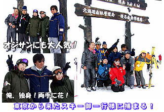 標高994M、マウントイゾラ山頂に到着!天候は晴れたり曇ったりとさすがに寒い! 撮影開始してすぐにちょっとしたハプニングが起きた。 東京から来たスキーヤーの団体さんにリエちゃんとアッコちゃん捕まる! 「モデルさんでしょ?若くてきれいだね〜!一緒に記念撮影させて下さ〜い。」との事。 本人達、「モデル?まっイイッか!」何だか解らないうちにこのアリサマ! ![]() |