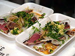 時折激しい雨が降る中、男性陣はテントを張り、女性陣は夕食の準備に大忙し!夕食の食材は、焼肉用の牛肉、焼き鳥、大きなカニの足、生ビールにチューハイ、ジュースなど・・・。 それにカツオのたたきまで!