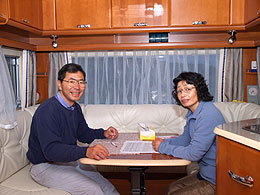 第1回目から参加されているオーナーさんにお話を伺いました。昨年のリポートを見てみると、ホビーを牽引していたはずなのに、今年はドイツ製のTABBERT PUCCINIで参加! ![]() 早速、車内にお邪魔してみると、「いらっしゃ〜い!」と、お出迎えして頂いたのは、札幌市のT.Hさんご夫婦。 「あのぉ〜前に牽引していたホビーは・・・?」と、聞いてみると「今年7月に買い換えました!」とのこと。 |
