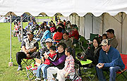 みんなが楽しくゲームをしている頃、エルム高原家族旅行村の管理棟の前では、キャンプ場のスタッフが作ったわたあめや、地元 の方の手作りリースを並べたお店(右写真)が、ゲーム大会に負けず劣らずの賑わいをみせていました。キャンプ場のスタッフの皆様、そして地元の皆様、ご協力ありがとうございました。 |