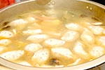 先程も言ったとおり、今年はバイキング形式。“あれ食べたい”、“これ食べたい”という家族の要望を聞い て、奥様達がバイキング会場へと向かいます(左写真)。バイキング会場のテーブルの上には、たっぷりのお肉、エビやホタテといった新鮮な魚貝類、温かい鍋や炊き込みごはんetc...高級ホテルに負けず劣らずの豪華な食材が勢揃い! どのコーナーにも行列ができ、みるみるうちに食材がなくなっていきます。 |