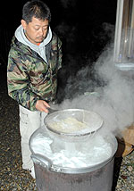 寒さ厳しい中で食べる温かいそばは、一味も二味も違うようで、どの方も口々に「美味しい」と絶賛していました。加々家さん、また来年も宜しくお願いします! ![]() そんな温かな雰囲気の横で、「わ〜!!間違って雨水を注いじゃったよ!」の声。 目を向けると、そこにはビールサーバーの所で、テントをつたって流れてきた雨水をしっかりとコップに注いでいるオーナーさんの姿が!!(右写真) カメラ目線ありがとうございます。(笑) 次ページへ |