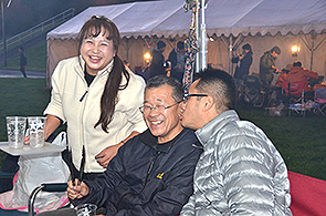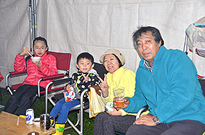 乾杯の音頭が終わると、それ〜!と言わんばかりに、各自、お皿やお盆を持って、バイキングコーナーへ。ジンギスカンや手羽先、キャンプ名物のトーイング鍋やお汁粉など種類豊富に用意。 雨が上がってから去年以上に、グッと気温が下がってきたので、温かい鍋が大人気でした。 ![]() |