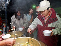 乾杯後、牛肉や牛タン、カニが炭火で焼かれ、網から したり落ちる肉汁の「ジューッ」と、いう音が食欲をそそります。そして、トーイング鍋や炊き込み御飯もできあがったようです。 それでは、楽しい懇親会のひと時をご覧下さい。 |