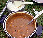 上野さんのご家族は、ダッチオーブンに挑戦中!ダッチオーブンとは、分厚い鍋の中に食材を入れて鍋の上下から加熱する料理手法。 上野さんのお父さんは、「過去2度挑戦してますが、上下の火加減のバランスが難しいですよ!」と、話しておられました。 できばえは、上々のようです。 |