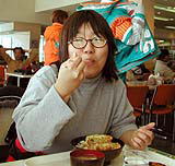 ![]() 天候が芳しくないので早めのランチタイムとなった。へんなビデオばっかり撮影するので さっちゃんに締められるユウちゃん(左写真)。 ![]() 食事をしながらビデオを見て一人で ウケまくるユウちゃん! |